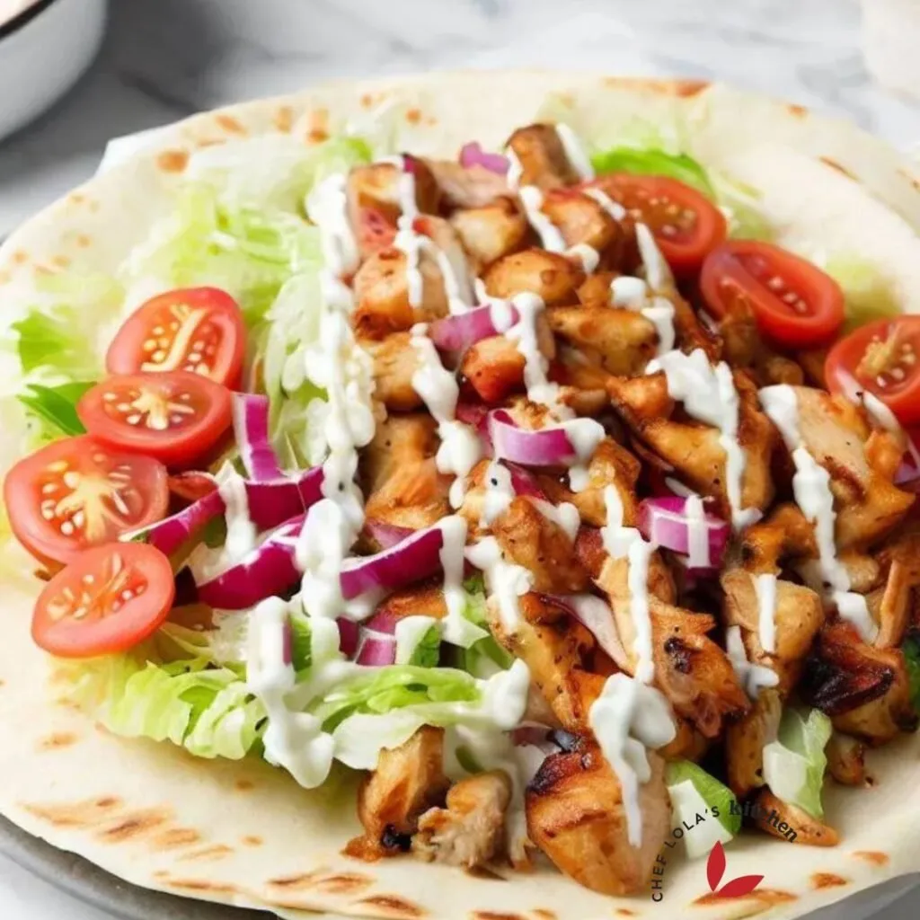 - Assemble the shawarma by spreading tahini or garlic sauce on the warm bread, adding chicken and toppings, and wrapping the filling.