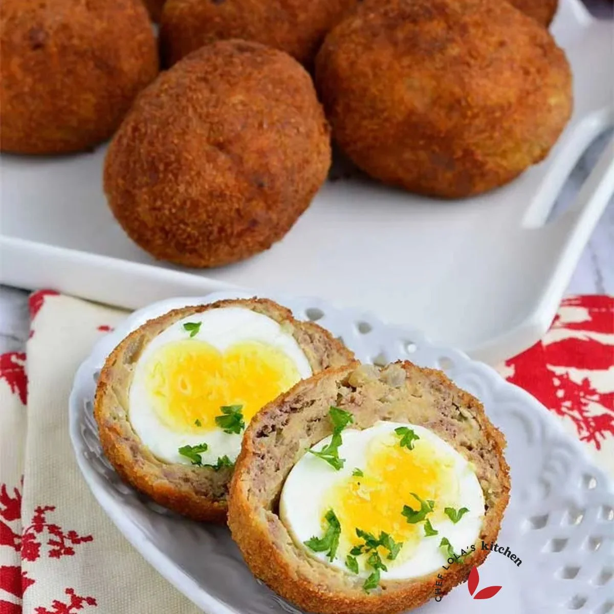 Have you ever wondered why the name scotch eggs? The original term was scotched egg - scotching used to refer to the art of hacking meat until minced and placing it around the boiled egg.