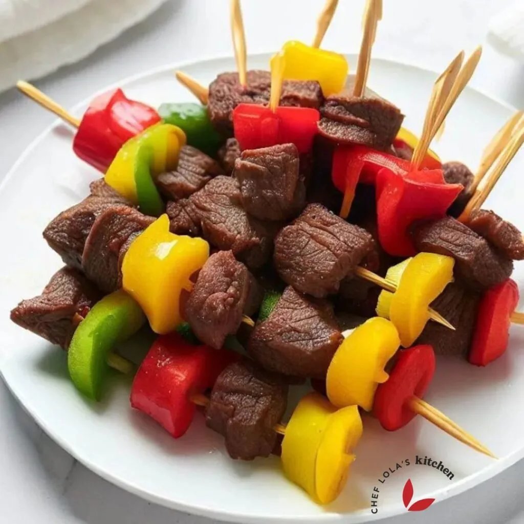 - Thread the beef and bell pepper chunks onto toothpicks, alternating between meat and pepper or arrange them as desired.
