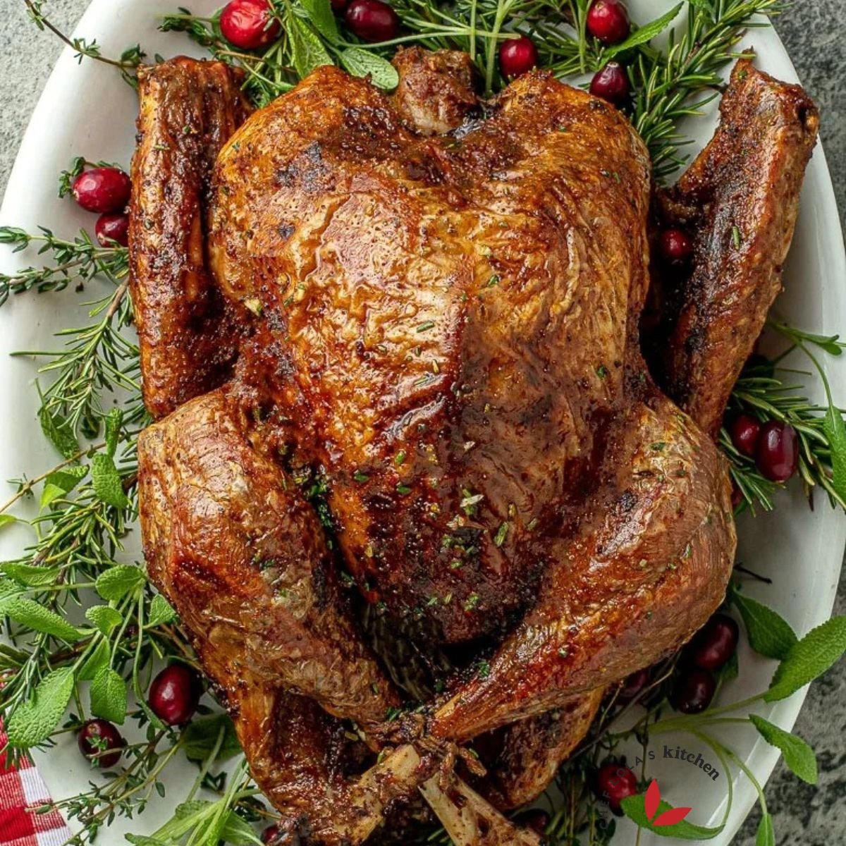 – Turkey Brine – salt Garlic butter/oil mixture – Garlic, rosemary, thyme, melted unsalted butter or oil Seasoning paprika, chili powder, onion powder, garlic powder, ground cumin, oregano or thyme, dried rosemary, chicken stock powder, black pepper Stuffing – Onion, head garlic, rosemary, thyme